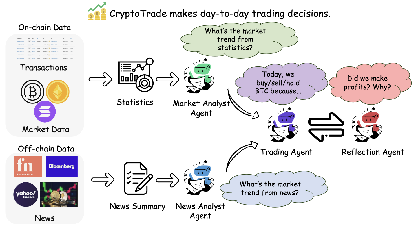CryptoTrade is an LLM-based trading agent designed to enhance cryptocurrency market trading by integrating both on-chain and off-chain data analysis. It leverages the transparency and immutability of on-chain data, along with the timeliness and influence of off-chain signals, such as news, to offer a comprehensive view of the market. CryptoTrade also incorporates a reflective mechanism that refines its daily trading decisions by assessing the outcomes of previous trades. It simulates the buy and sell behaviors of human traders in the cryptocurrency market. An overview of this simulation is shown in the figure below