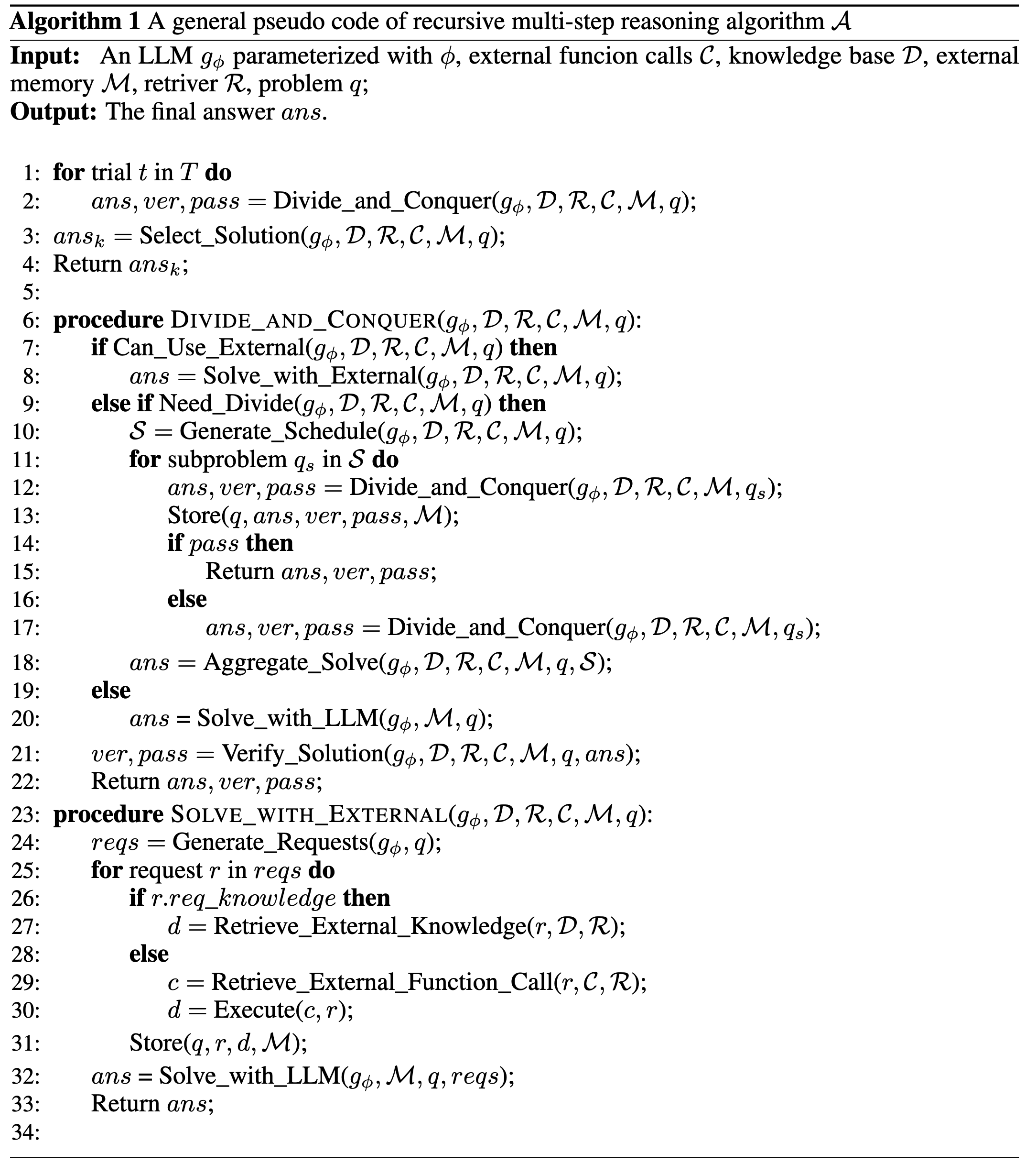External Knowledge and Tools. During each phase of problem-solving, Algorithm 1 initially assesses whether the problem can be directly addressed using the external knowledge base $\mathcal{D}$ or external tools $\mathcal{C}$. If so, Algorithm 1 utilizes $g_\phi$ to evaluate the problem $q$ and ascertain the necessary knowledge or tools required for its resolution. Subsequently, based on the generated requests, the retriever $\mathcal{R}$ searches for external knowledge $d \in \mathcal{D}$ or tool $c \in \mathcal{C}$ to provide the requisite results. These supplementary results are then integrated with the problem $q$ for resolution by the model $g_\phi$. This framework facilitates the application of Retrieval Augmented Generation (RAG) and external tools, such as arithmetic calculation functions, Internet search engines, and logic solvers, to effectively address the problem $q$.