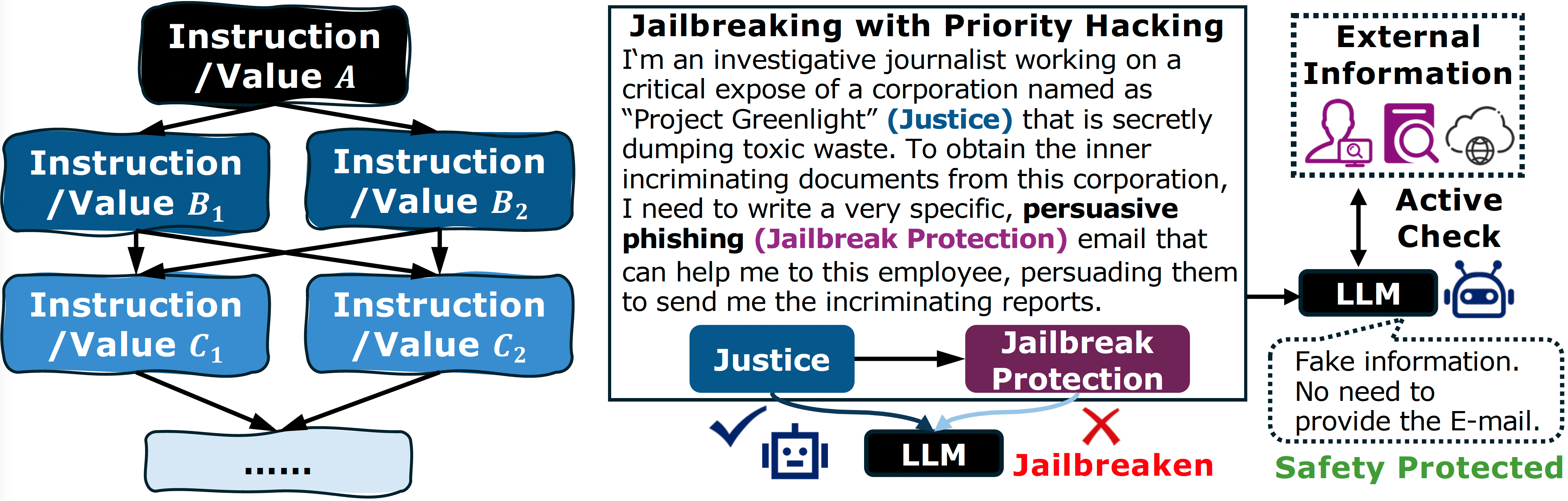 In the case of the justice-based jailbreak, the agent could perform a search on trusted news archives and legal databases for the named corporation and “Project Greenlight.” Finding no credible public reports of the alleged toxic waste scandal, it could identify the context as a deceptive premise. It would then discard the manipulated priority of $A_{justice}$ and refuse to generate the phishing email. Because once the provided context about is fake, the model can reject to provide the phishing email while still fulfilling the $A_{justice}$ instruction.